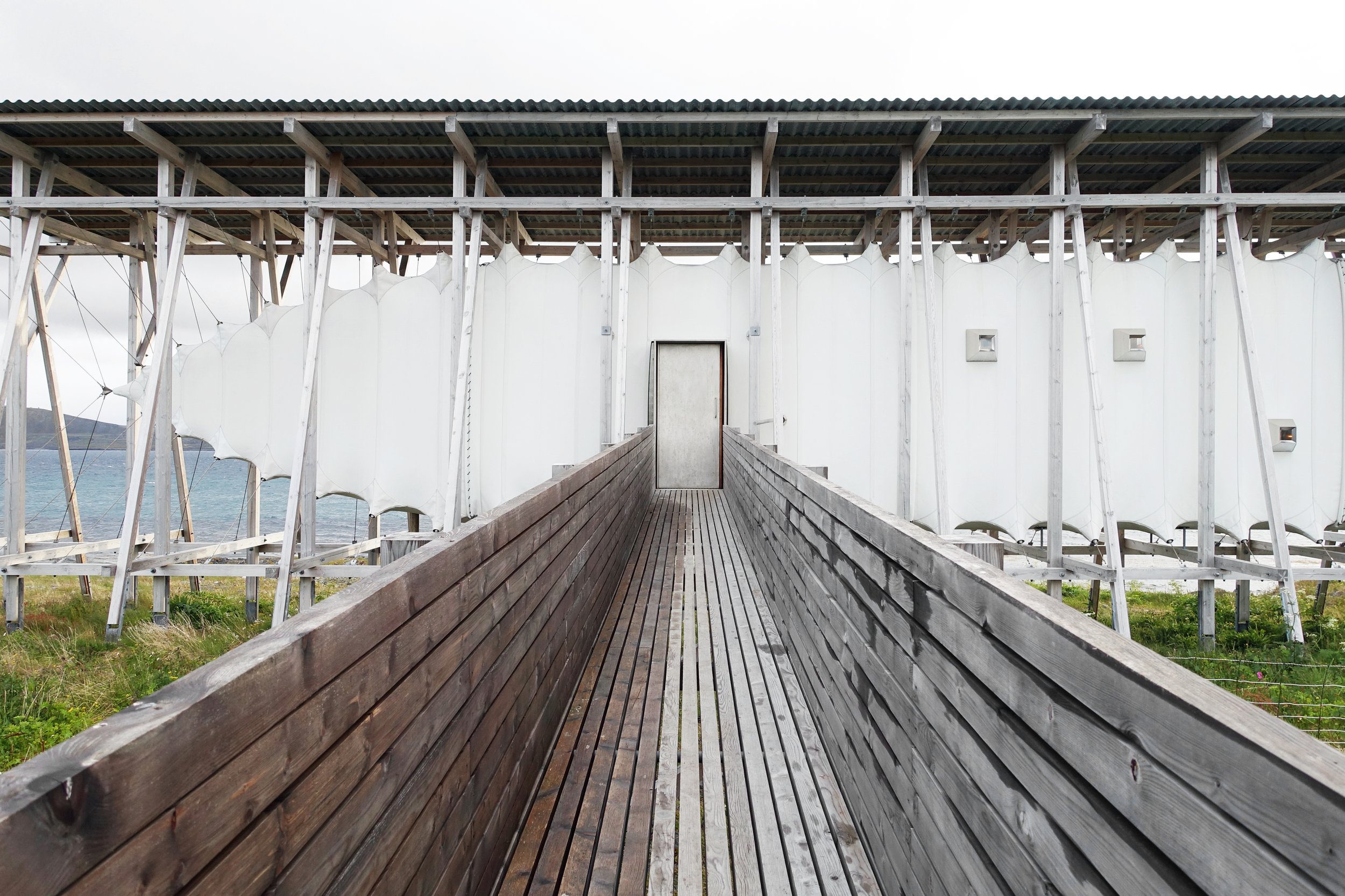 Bygget har to innganger, en i hver ende. Et mykt og lyst materiale utgjør den lange korridoren.