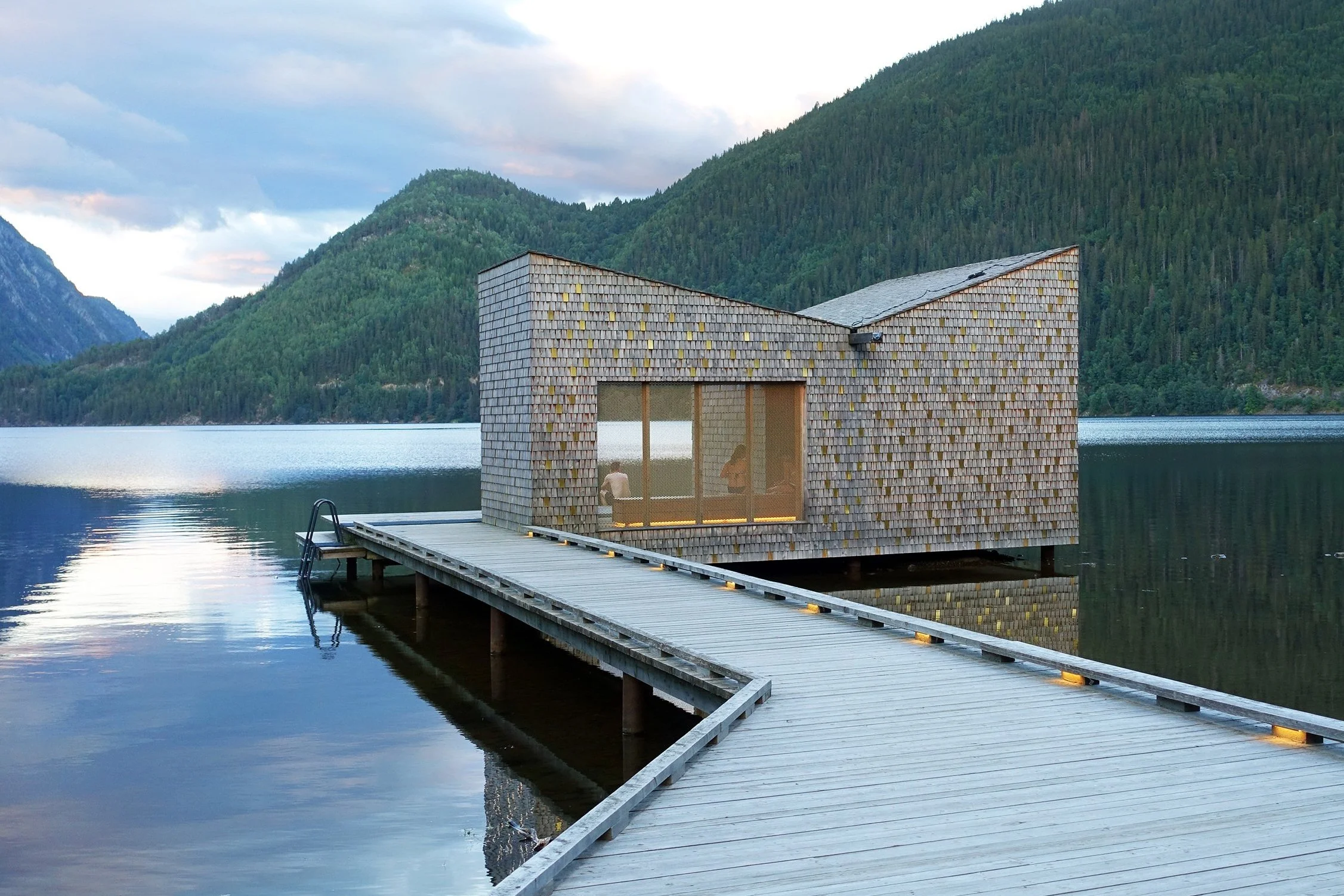 Soria Moria Sauna ligger ved innsjøen Bandak i Dalen i Tokke kommune, en kort spasertur fra det historiske hotellet Dalen Hotel.