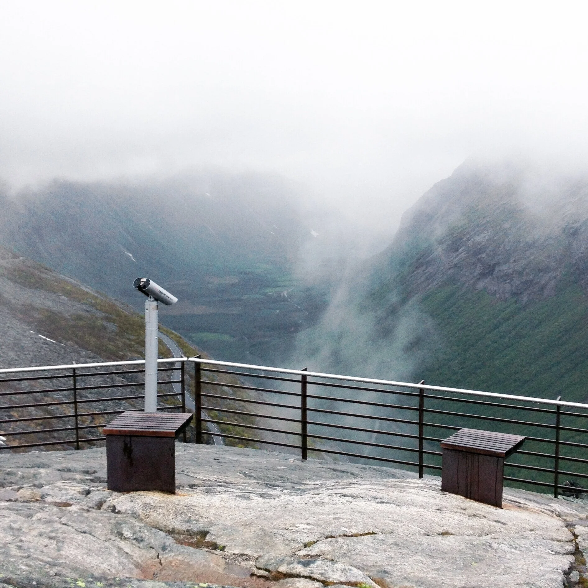 Det er juni men landskapet er hvitt av gammel og ny snø. Tåken ligger som en tykk dyne over fjellene og veien går som en grå bølgete stripe gjennom dalen før den forsvinner inn i tåken. Det er trolsk stemning og snøen har lagt seg som et melisdryss over lyngen. Veien er våt av sludd og et gult lys blinker fremme på dashbordet, 2 grader. Et sted der borte i enden av dalen ligger utsikten alle snakker om. Trollstigen.